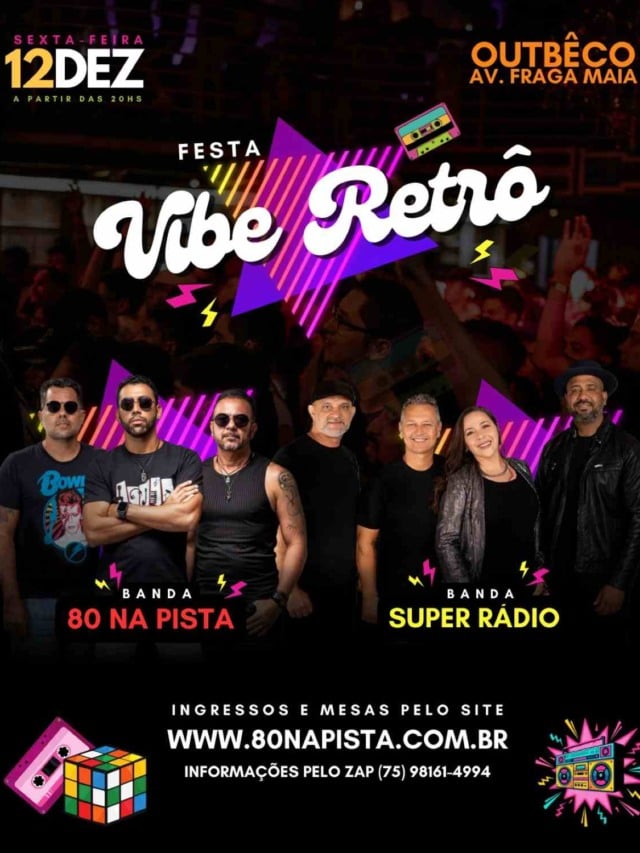 No palco, duas das bandas mais queridas do cenário retrô na Bahia garantem um espetáculo memorável: Banda 80 na Pista e Banda Super Rádio. Com repertórios repletos de hits que marcaram gerações, as atrações prometem uma experiência vibrante, reunindo energia, interação e muita memória afetiva.