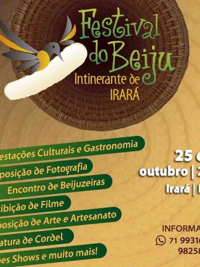 Entre as atividades programadas, destacam-se as manifestações culturais e gastronômicas, que terão como protagonistas o tradicional beiju, uma iguaria símbolo da culinária regional, e seu importante papel na cultura local. Além disso, o evento contará com uma exposição de fotografia, celebrando a história e as paisagens de Irará, encontros de beijuzeiras, responsáveis por manter viva a arte de produzir o alimento, e uma exibição de filmes que dialogam com temáticas regionais.