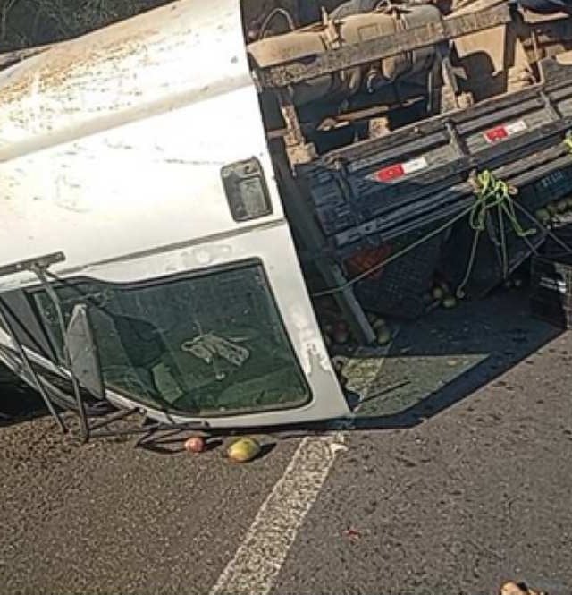 Após o acidente, a carga de manga e maracujá ficou espalhada pelo trecho da rodovia. As frutas já foram removidas do local.