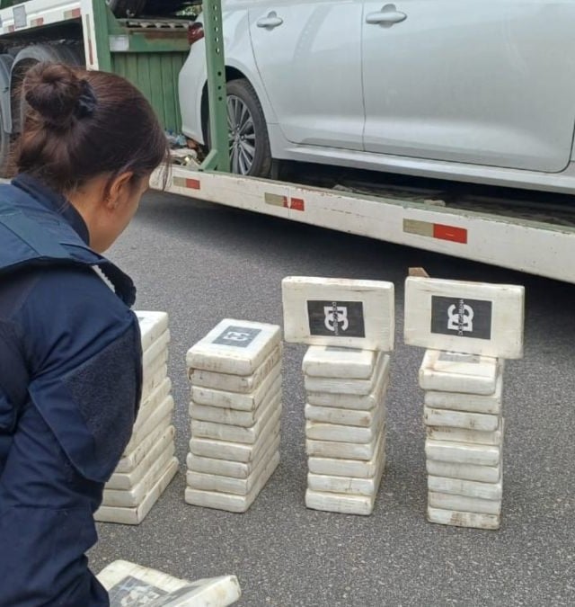 Nesses casos, a PRF fiscaliza tanto a carreta quanto os veículos que estão sendo transportados. Foi nesse contexto em que a equipe localizou no interior de um dos veículos 60 tabletes de skunk, pesando 37,35 kg e 50 tabletes de cocaína, isto é 54,5kg da droga.