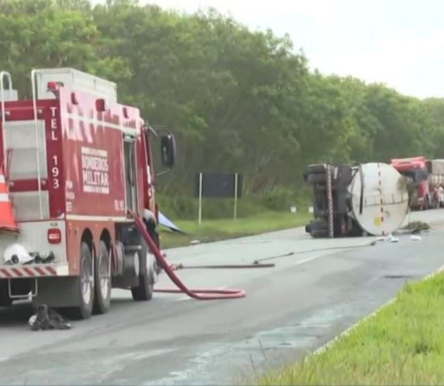 Equipes da PRF, Dnit e Corpo de Bombeiros estão no local realizando a sinalização, controle do tráfego e ações de segurança. A corporação informou ainda que o condutor do caminhão-tanque saiu ileso do veículo.