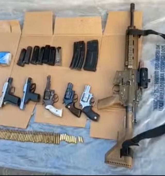 Com o bando, os policiais apreenderam oito armas de fogo, sendo um fuzil, quatro pistolas, três revólveres, além de mais de 150 munições e drogas.