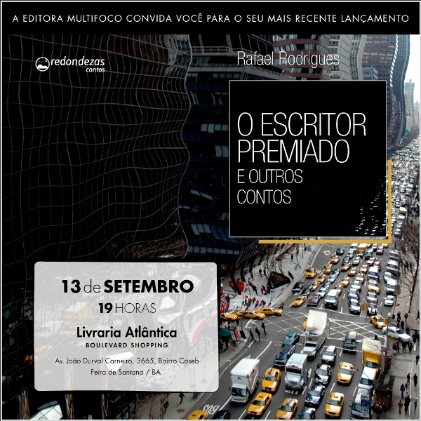 O feirense Rafael Rodrigues vai lançar na próxima terça-feira (13) “O Escritor premiado e outros contos". É o primeiro livro dele publicado pela Editora Multifoco. O lançamento acontecerá às 19:00h, na livraria Atlântica, no Shopping Boulevard.