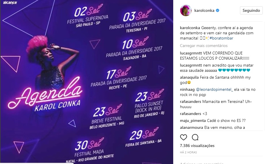 A rapper e compositora Karol Conka estará em Feira de Santana no dia 29 de setembro. Segundo informações, a cantora fará um show no Boulevard Shopping, mas até o momento não há muitos detalhes sobre o evento.