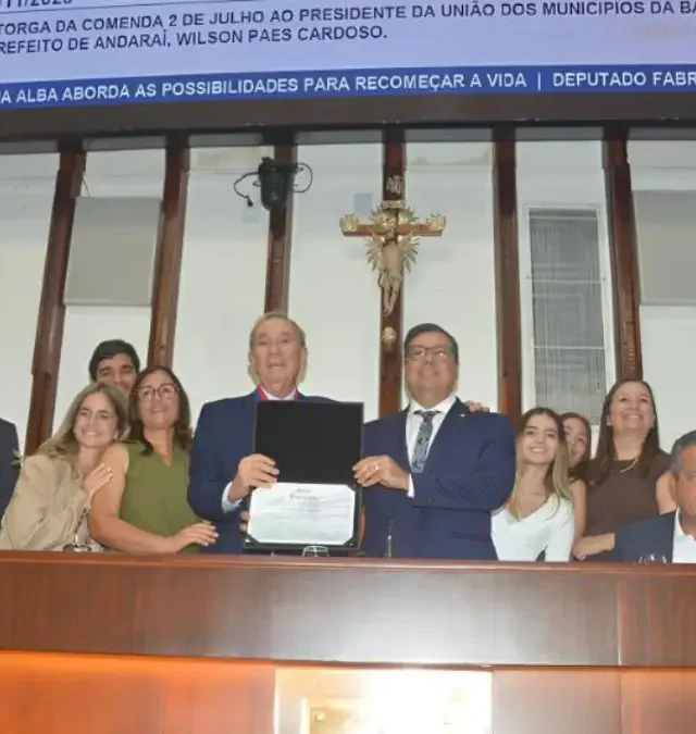 Prestígio e emoção marcaram a sessão especial da Assembleia Legislativa da Bahia (Alba) que concedeu, na manhã de sexta-feira (14), a Comenda 2 de Julho ao prefeito de Andaraí e presidente da União dos Municípios da Bahia (UPB), Wilson Paes Cardoso. Ladeado por autoridades como o ministro da Casa Civil da Presidência da República, Rui Costa, senadores Jaques Wagner e Otto Alencar e o vice-governador Geraldo Júnior, o homenageado foi reverenciado com uma solenidade que exaltou sua trajetória em defesa do municipalismo e do desenvolvimento regional.