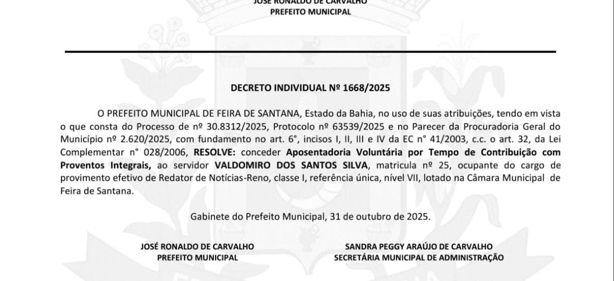 O advogado e atual gerente legislativo da Câmara de Vereadores de Feira de Santana, Eduardo Pimentel Gomes Gonçalves, fez um texto em homenagem a Valdomiro dos Santos Silva, que desempenhava o cargo de redator de notícias na Casa. Foi publicada na edição deste sábado (1º) do Diário Oficial a aposentadoria de servidor.