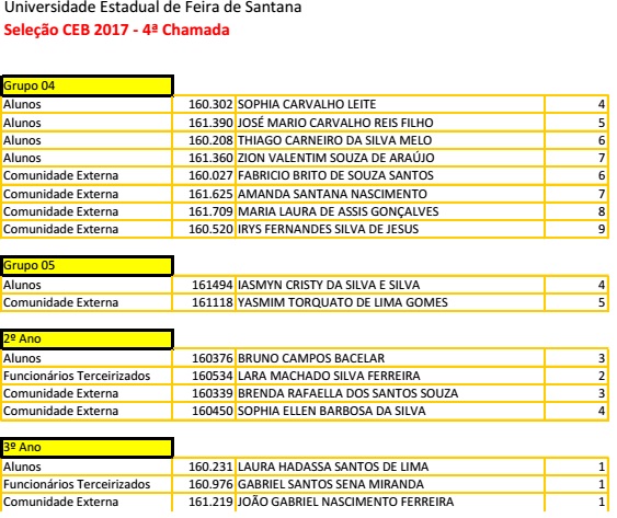 A Coordenação de Seleção e Admissão divulga a quarta chamada da seleção para o sorteio público do Centro de Educação Básica CEB/Uefs.