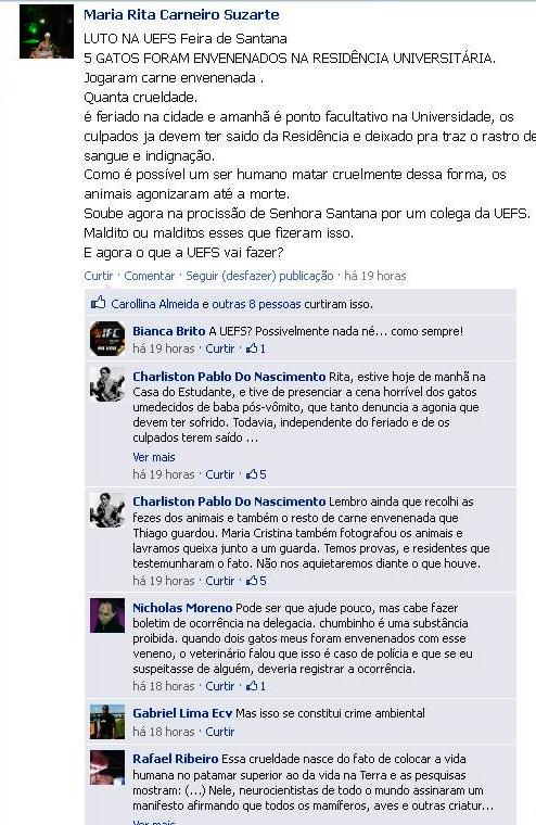 “Estive hoje de manhã na Casa do Estudante, e tive de presenciar a cena horrível dos gatos umedecidos de baba pós-vômito, que tanto denuncia a agonia que devem ter sofrido. Todavia, independente do feriado e de os culpados terem saído da residência, pretendo que venhamos a dar queixa do fato, visto incorrer em um crime”, disse o professor a uma professora no Facebook.