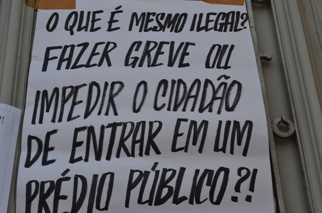 Os professores colaram cartazes nas portas da prefeitura, que estavam fechadas, pedindo que o prefeito ‘mostre que está aberto ao diálogo’. Em um dos cartazes os professores perguntavam: ‘O que é mesmo ilegal? Fazer greve ou impedir o cidadão de entrar em um órgão público?’