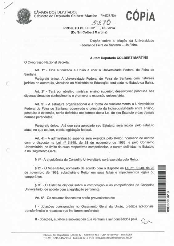 O deputado federal Colbert Martins propôs ao Congresso Nacional a criação da Universidade Federal de Feira de Santana (UniFeira). O Projeto de Lei foi encaminhado na última quarta-feira (3).