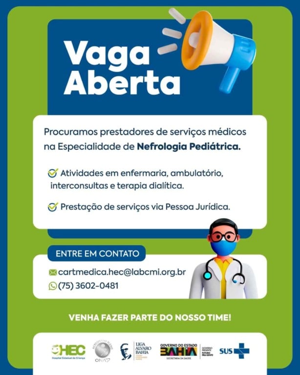 O Hospital Estadual da Criança (HEC), em Feira de Santana, está com vaga aberta para médico na especialidade de Nefrologia Pediátrica. A contratação será feita sob o regime de Pessoa Jurídica (PJ).