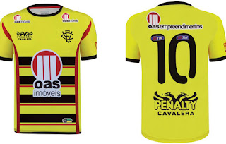 Acabou o suspense. Na manhã desta segunda-feira (26), a direção do Vitória apresentou o seu terceiro uniforme. O evento ocorreu na estande de uma construtora, na Avenida Paralela. Como antecipado pela diretoria de marketing, o uniforme é predominantemente amarelo, com detalhes em vermelho na vertical e listras rubro-negras na horizontal.