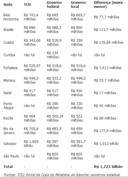 Governos federal, estaduais e Tribunal de Contas da União (TCU) divergem sobre o valor das obras de 10 dos 12 estádios que receberão partidas da Copa do Mundo no Brasil em 2014.Levantamento a partir de relatório do TCU; do Portal da Copa, do Ministério do Esporte; e dos sites oficiais da Copa nos 12 estados-sede indica que a soma das diferenças entre o maior e o menor valor apontado para cada estádio chega a R$ 1,723 bilhão – cifra suficiente para reformar dois Maracanãs.