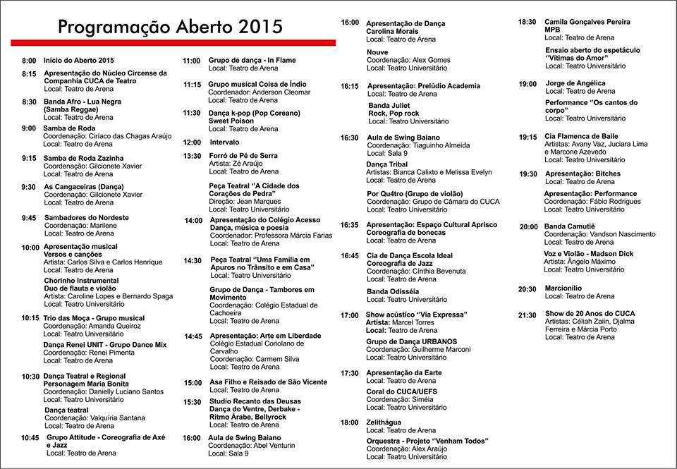 Tudo pronto para a realização do Aberto 2015, evento promovido pela Universidade Estadual de Feira de Santana (Uefs) com mais de 12 horas de atividades programadas para esta quinta-feira (17), no Centro Universitário de Cultura e Arte (Cuca), com entrada gratuita. As apresentações começam às 8 horas com artistas conhecidos e iniciantes.