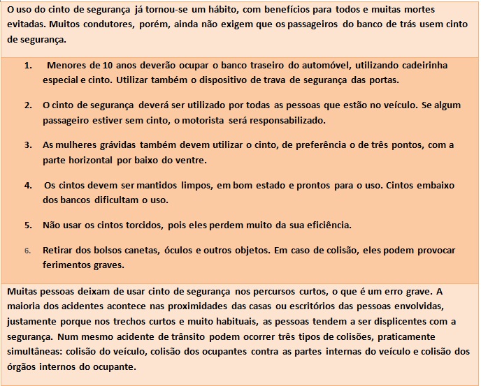O cinto de segurança é tão imprescindível para o motorista quando o capacete é para o motociclista. Ambos são equipamentos obrigatórios de segurança e devem ser usados por todos os ocupantes do veículo.