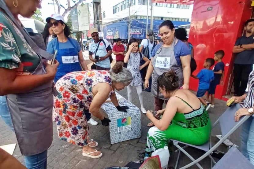 Produzido pela professora de Mosaico do Centro Universitário de Cultura e Arte (CUCA), Gabriele França, o projeto foi acompanhado pelo olhar atento de nove alunos, que observaram, atentos, a transformação de um singelo banco de concreto cru em uma obra de arte com o mosaico produzido com azulejos coloridos.