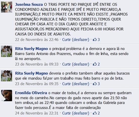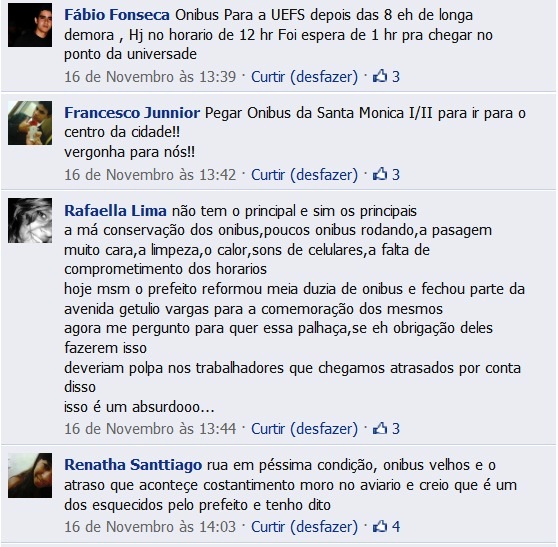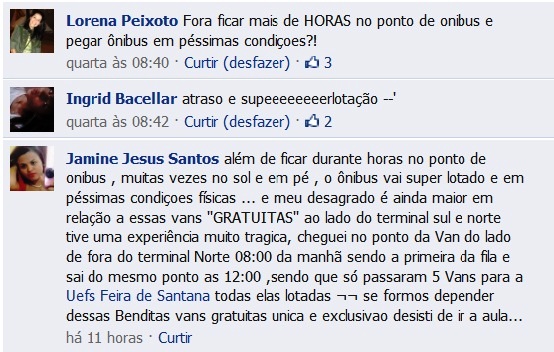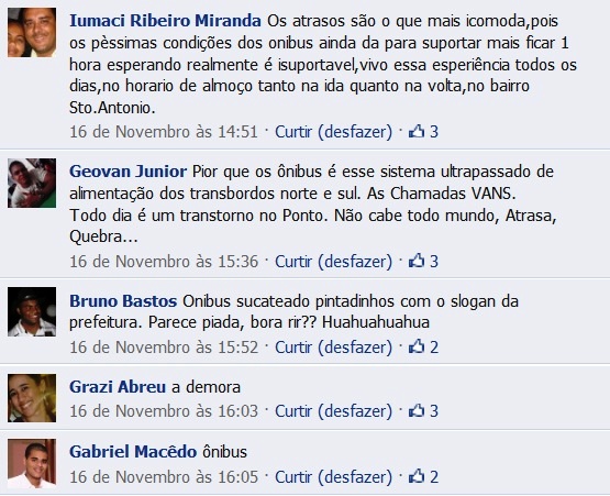 Também pelo Facebook internautas falam sobre o que mais incomodam no transporte coletivo (Arquivo):