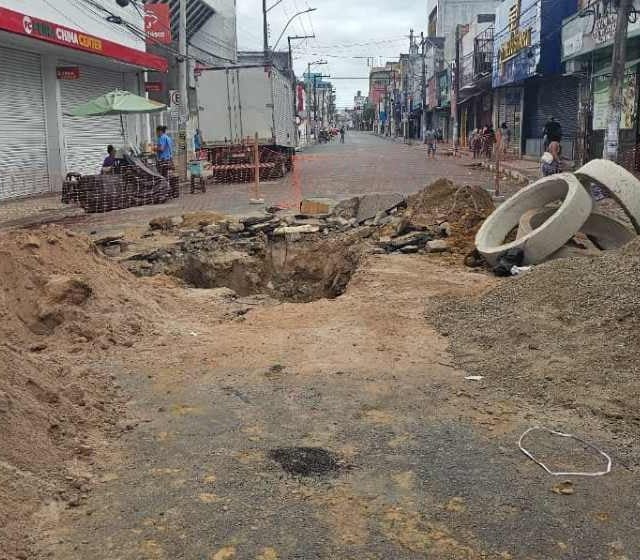 Um dos trechos principais da Rua Conselheiro Franco no centro de Feira de Santana está temporariamente interditado para o trânsito de veículos devido à realização de obras para reparação de um buraco que surgiu na via.