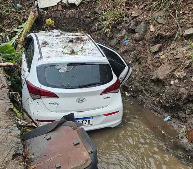 Um veículo modelo HB20 caiu dentro de um córrego na Rua Morro Verde, Caminho 9, no bairro Mangabeira, em Feira de Santana, na noite de quinta-feira (20), durante as fortes chuvas que atingiram a cidade. De acordo com moradores, o acidente aconteceu por volta das 23h.