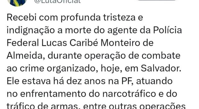 “Recebi com profunda tristeza e indignação a morte do agente da Polícia Federal Lucas Caribé Monteiro de Almeida, durante operação de combate ao crime organizado, hoje, em Salvador. Ele estava há dez anos na PF, atuando no enfrentamento do narcotráfico e do tráfico de armas, entre outras operações de alta periculosidade.