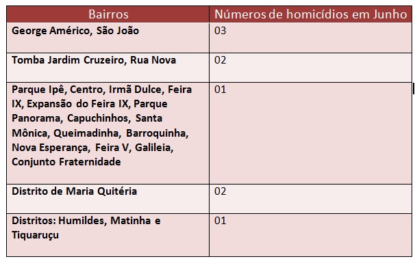 Ainda de acordo com o levantamento feito pelo repórter Aldo Matos, entre os bairros da cidade, George Américo, São João, Tomba, Jardim Cruzeiro e Rua Nova estão entre os que mais registraram crimes em junho de 2012. Veja a tabela a seguir.