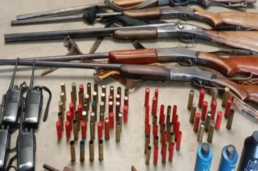 Durante a varredura no terreno, os agentes localizaram um esconderijo contendo cinco espingardas e 88 cartuchos de diversos calibres, além de equipamentos empregados na atividade ilegal. O material reforça a suspeita da prática de crimes ambientais na localidade.