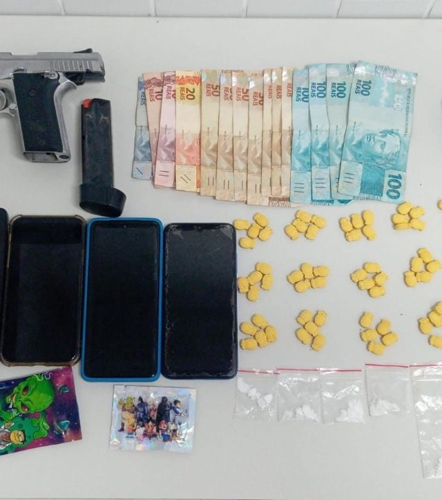 Durante a abordagem, os policiais encontraram com os suspeitos uma pistola calibre .40, carregador e munições, além de comprimidos de ecstasy, porções de cocaína, dinheiro em espécie e uma máquina de cartão. Todo o material foi apreendido.