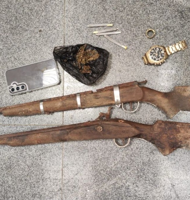 Durante as buscas no imóvel, os policiais localizaram duas espingardas sem identificação aparente, além de um saco com erva in natura semelhante à maconha e quatro cigarros da mesma substância. Todo o material apreendido foi apresentado na Delegacia de Polícia Civil para adoção das medidas cabíveis.