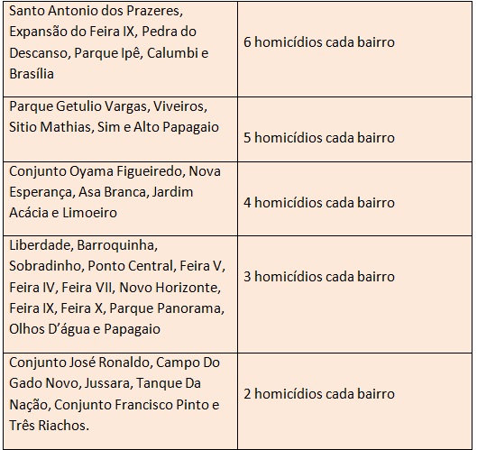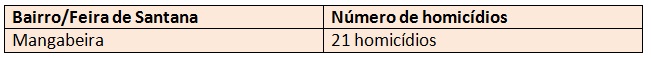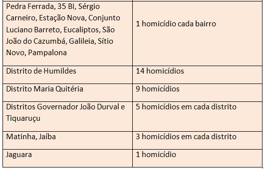 O bairro Mangabeira liderou no número de assassinatos este ano com 21 homicídios, seguido dos bairros Rua Nova e Conceição. Veja abaixo a relação com os demais bairros e respectivos números de homicídios: