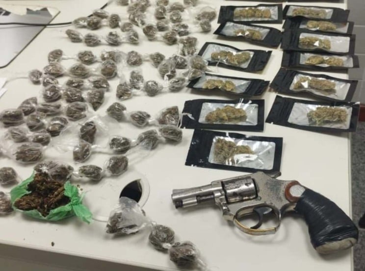 Com o homem, os policiais apreenderam um revólver calibre .22 cromado, 95 buchas de maconha e um celular Xiaomi azul.