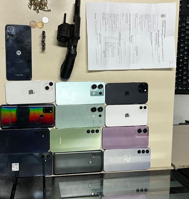 Durante as buscas, uma motocicleta com características semelhantes às utilizadas nos crimes foi encontrada em uma borracharia. No local, os policiais localizaram diversos objetos supostamente descartados pelo suspeito, entre eles um capacete, uma camisa UV azul, uma bolsa contendo 12 aparelhos celulares de diversas marcas e um revólver Taurus calibre .38, com cinco munições intactas.