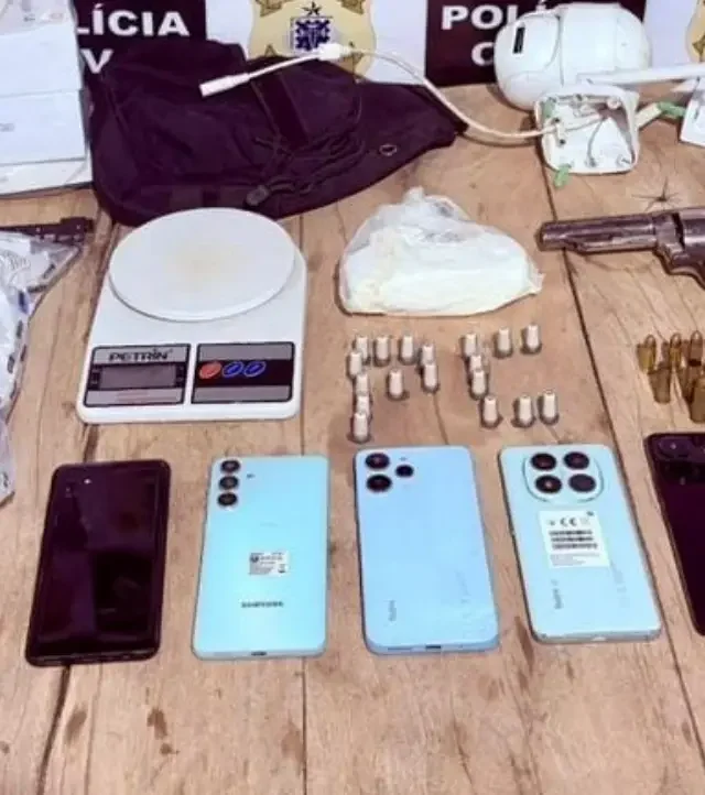 Um revólver calibre 38, munições, celulares e porções de drogas foram apreendidos com os suspeitos.