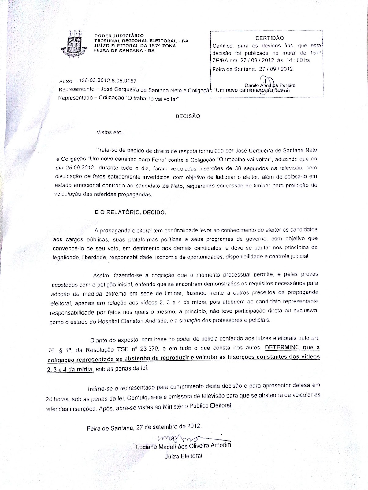 "Concedo em parte a liminar pleiteada determinando que os representados se abstenham de reproduzir e divulgar o áudio e a degravação da gravação veiculada na propaganda eleitoral impugnada na internet, rádio e televisão, devendo providenciar a sua retirada destes veículos em até 24 horas, sob pena de multa de R$1.000,00", diz um trecho da decisão.