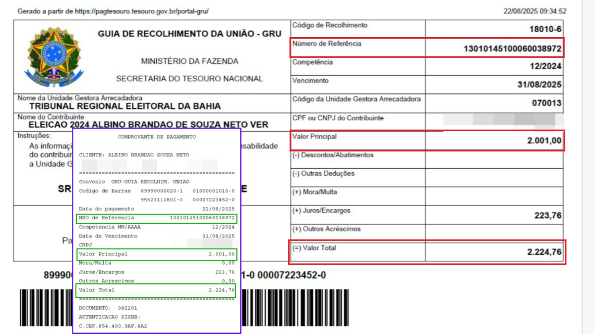 De acordo com documentos aos quais o Acorda Cidade teve acesso, o suplente de vereador realizou a devolução do valor à Justiça. Um boleto e um comprovante de pagamento bancário indicam que Albino pagou R$ 2.224,76 ao Tesouro Nacional. Após o pagamento da dívida, a Justiça solicitou a retirada do nome de Brandão do SerasaJud.
