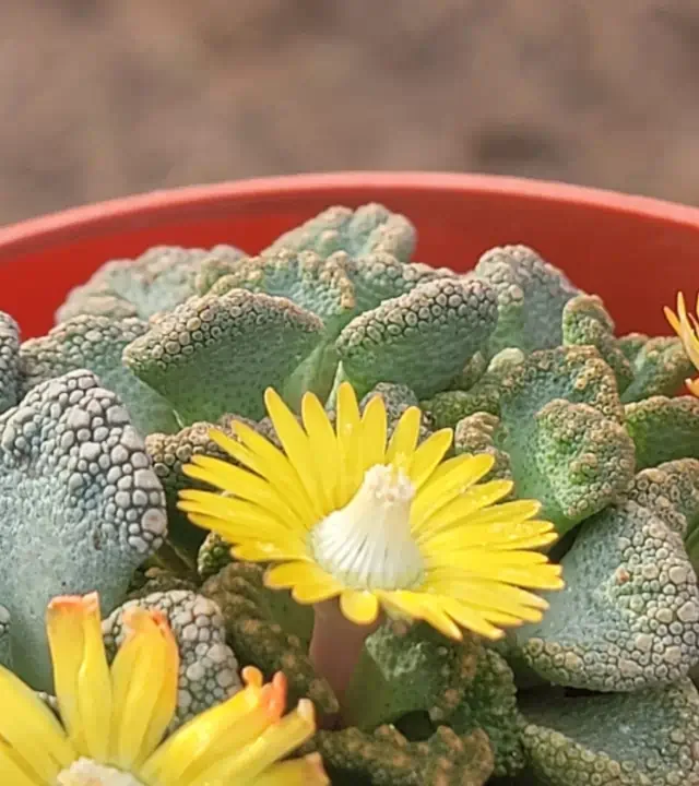 A segunda vantagem é a impressionante resistência da Titanopsis calcarea à falta de água. Suas folhas espessas armazenam umidade suficiente para sobreviver com regas muito espaçadas, tornando-a ideal para quem tem rotina corrida ou esquece de cuidar das plantas com frequência. Ela não apenas tolera longos períodos de seca, como prefere viver assim — excesso de água é o verdadeiro inimigo. É uma planta que prospera com o mínimo, respondendo melhor a solos arenosos, regas moderadas e ambientes quentes.