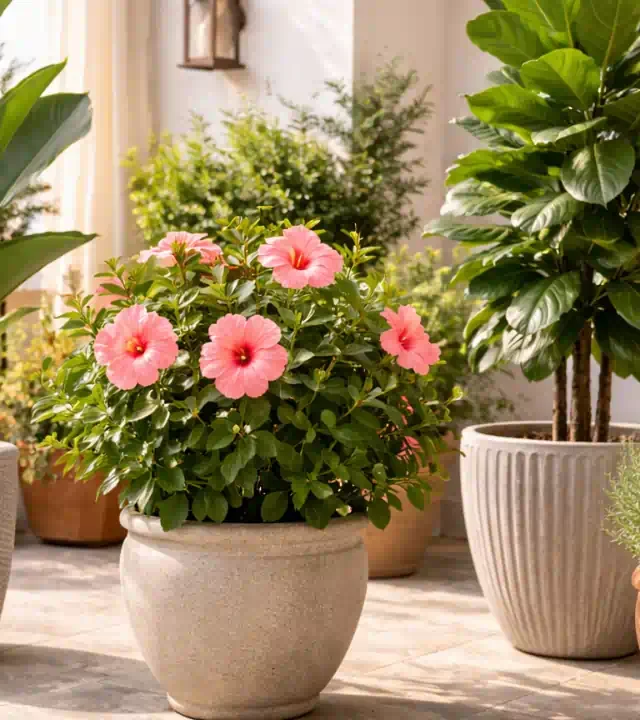 Para quem quer flores o ano inteiro, o hibisco é insuperável. Suas flores grandes e vibrantes chamam atenção e se destacam lindamente contra o cinza do piso. Quando plantado em vaso grande e bem nutrido, o hibisco cresce com vigor, formando arbustos cheios e com floração constante.