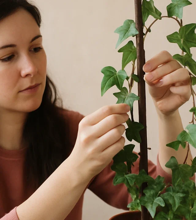 O segundo ponto é a inclinação. Se o tutor estiver muito afastado da base da planta ou inclinado demais, a hera vai buscar o caminho mais fácil — e, muitas vezes, crescerá torta, contornando obstáculos ou se apoiando nos próprios galhos, o que compromete o visual e dificulta a poda.