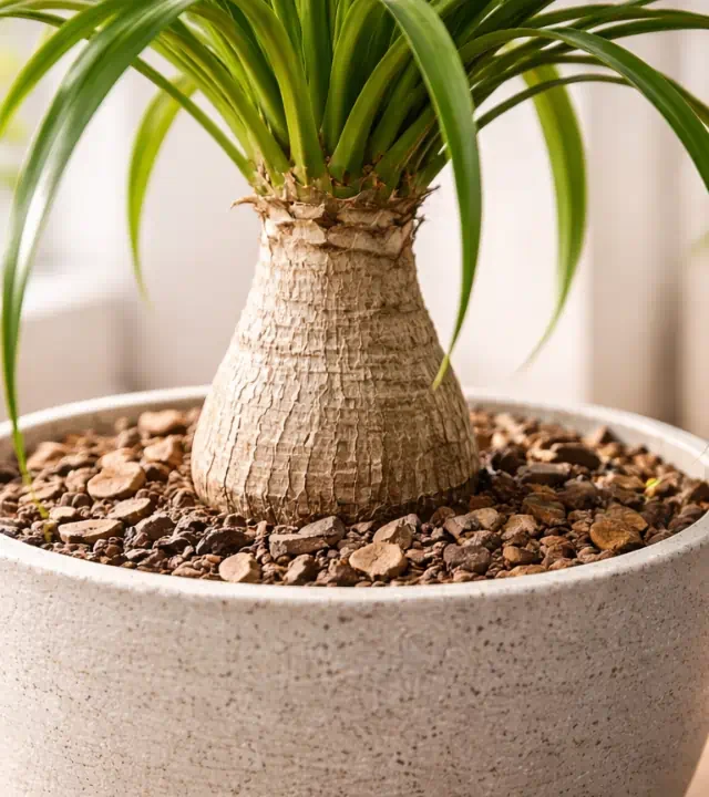A beleza da nolina está no contraste entre sua copa leve e seu tronco robusto. E essa forma não se constrói da noite para o dia — ela se forma ao longo de meses ou anos de adaptação às condições certas. Quando você reduz a frequência da rega, está ensinando a planta a se proteger, a se fortalecer e a assumir sua forma mais autêntica.