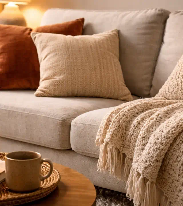 Almofadas, mantas e capas de sofá também entram nessa equação. Usar tecidos com tramas mais fechadas e toque macio estimula o conforto visual e sensorial, ativando no cérebro a ideia de calor e segurança. É o mesmo princípio das roupas de inverno: a textura acolhe.